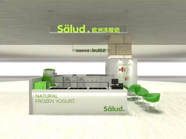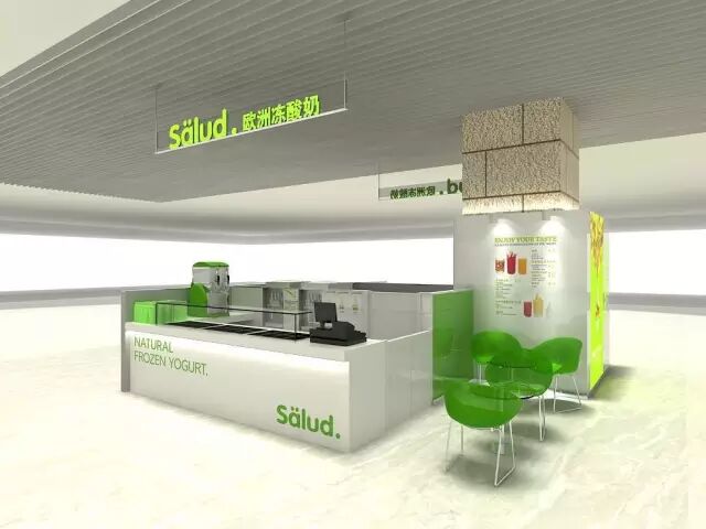店面同样承袭了salud冻酸奶全球统一的时尚绿白搭配,简洁大方。下面就是店面的装修效果图,清新、简洁、时尚。