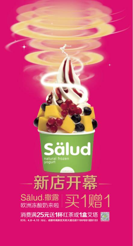 4月8日,salud冻酸奶成都第6家店面马上就开业了,店址也是在高新区,坐落在集国际、时尚、潮流于一身的、新落成的成都银泰中心in99店的负一层,这对周边写字楼里的白领们、周围诸多高档小区里的居民无疑是个令人兴奋的事情,而且,开业期间买就送。