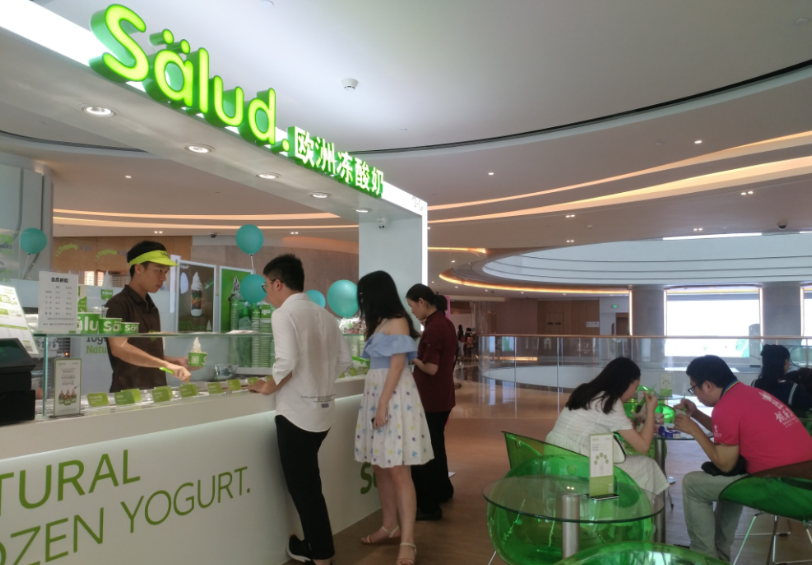 Salud冻酸奶位于商场二楼,电梯旁,新店开业,买就送